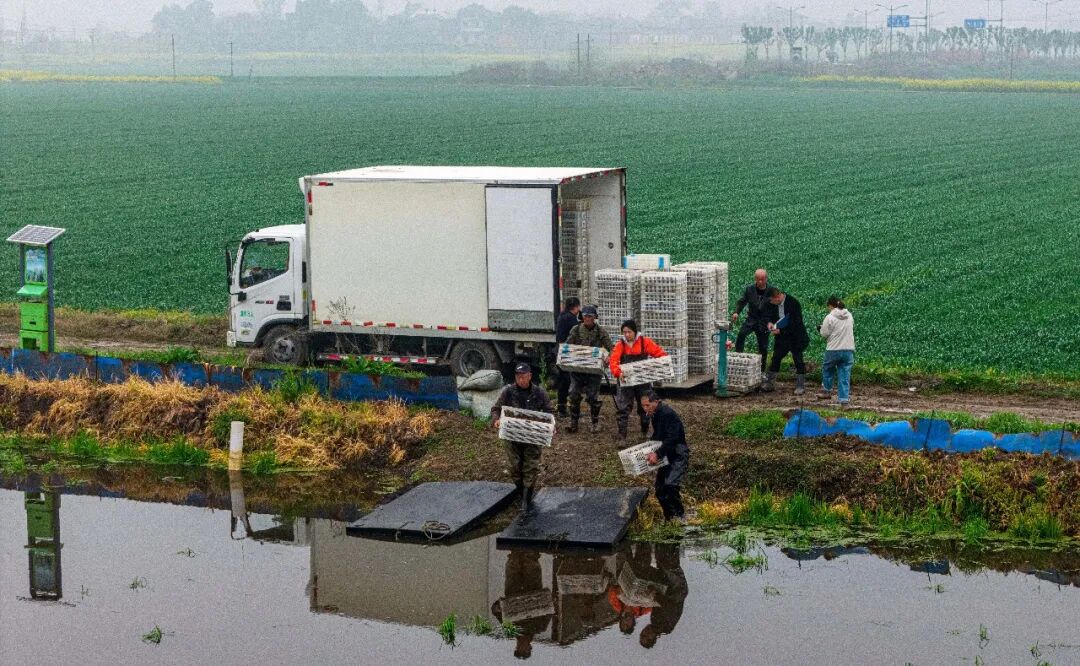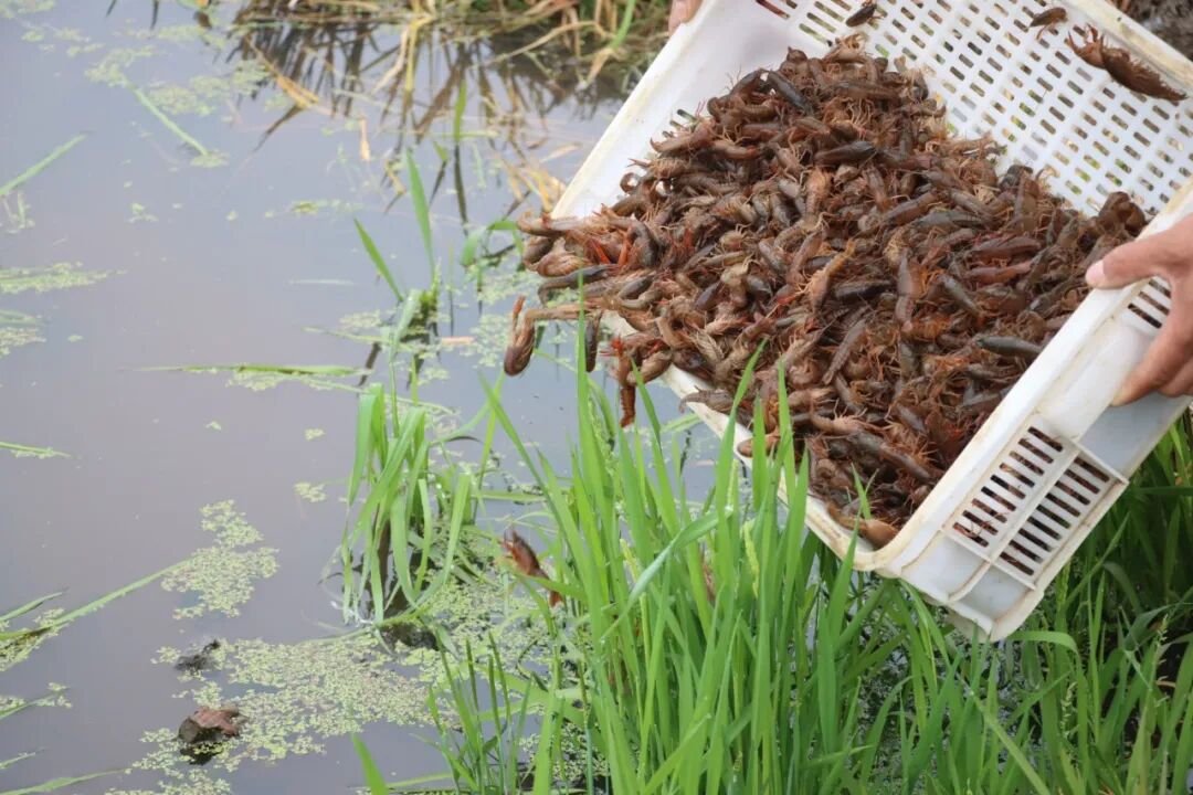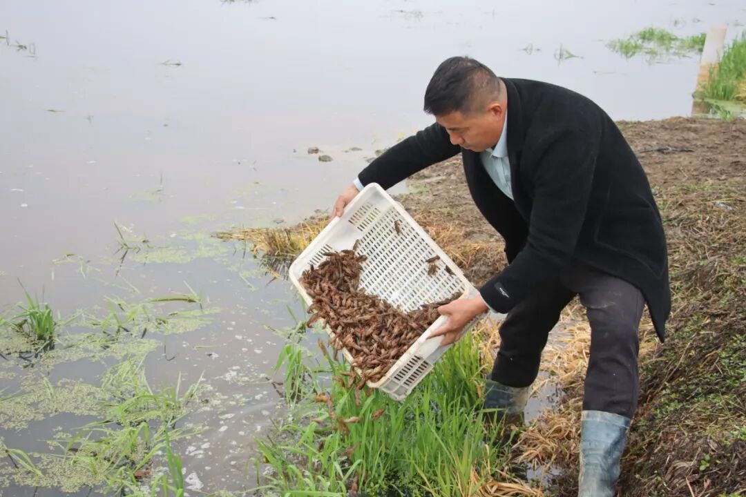 记者在现场看到,工人们正将一箱箱活蹦乱跳的虾苗从运输车上卸下,经过适应性处理后,均匀地投放进波光粼粼的虾田。这些虾苗活力充沛,入水后迅速四散游开,为宁静的水田注入了勃勃生机。