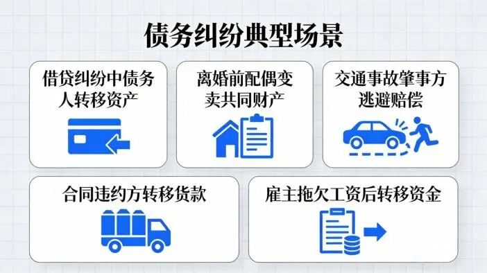 合同违约方转移货款、雇主拖欠工资后转移资金等。