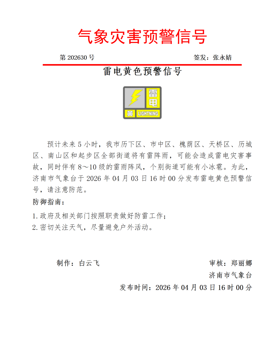4月3日,记者从济南市气象局获悉,预计未来5小时,济南市历下区、市中区、槐荫区、天桥区、历城区、南山区和起步区全部街道将有雷阵雨,可能会造成雷电灾害事故,同时伴有 8~10 级的雷雨阵风,个别街道可能有小冰雹。为此,济南市气象台于 2026 年 4月 3 日 16 时 00 分发布雷电黄色预警信号,请注意防范。