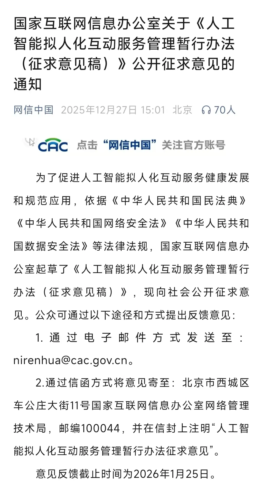 2025年12月27日,国家互联网信息办公室发布《人工智能拟人化互动服务管理暂行办法(征求意见稿)》,旨在为人工智能拟人化互动服务划定合规边界,推动行业健康有序地发展。