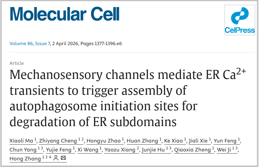 2026年4月2日,中国科学院生物物理研究所张宏团队在《Molecular Cell》发表题为“Mechanosensory channels mediate Ca2+transients to trigger assembly of autophagosome initiation sites for degradation of ER subdomains”的研究论文,首次揭示机械感知通道介导Ca2+瞬变触发内质网片段降解的分子机制。该发现为内质网功能障碍相关疾病的治疗提供了新的研究方向。