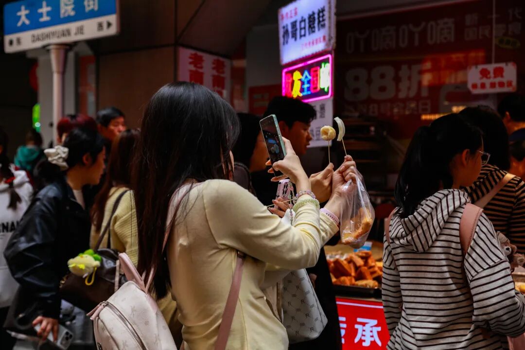 游客们一手拿着美食