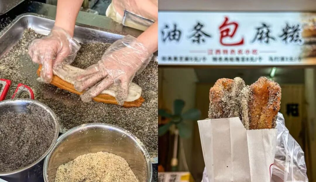 把麻糍平铺在油条上