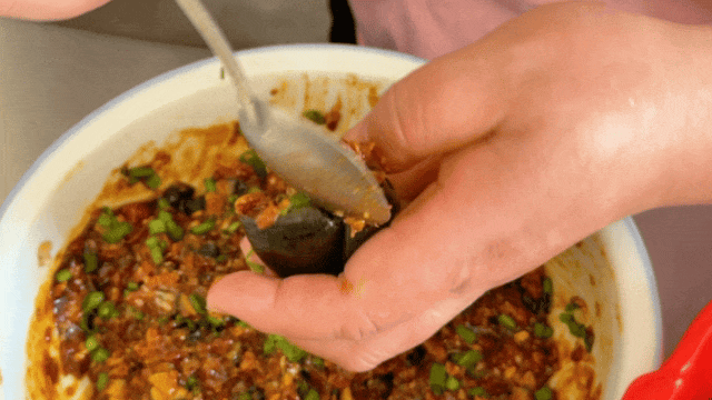 嬢嬢告诉我们:这里有个窍门,肉不能塞得太满,不然烧好了嗦不出来,那就要“急煞人”了。