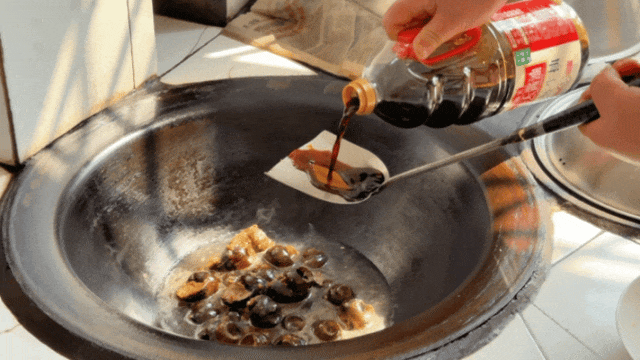 锅里倒油,下田螺,再放黄酒、老抽、生抽、冰糖——不能多翻,只能轻轻推,不然肉要“逃出来”的。