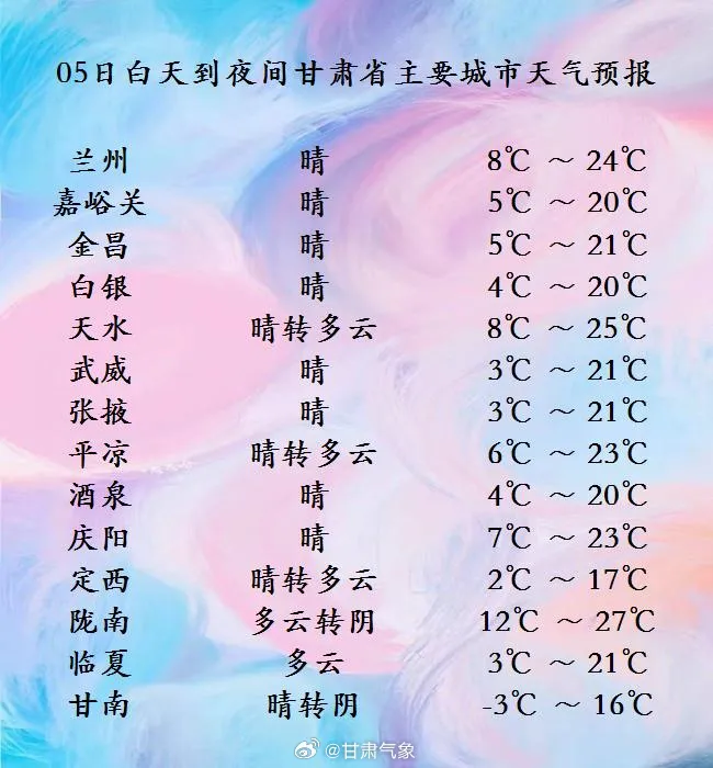 4月5日白天,全省各地晴或多云。另外,武威、白银、庆阳三市有4-5级西北风,酒泉市有4-5级偏东风,上述局部地方有扬沙或浮尘。