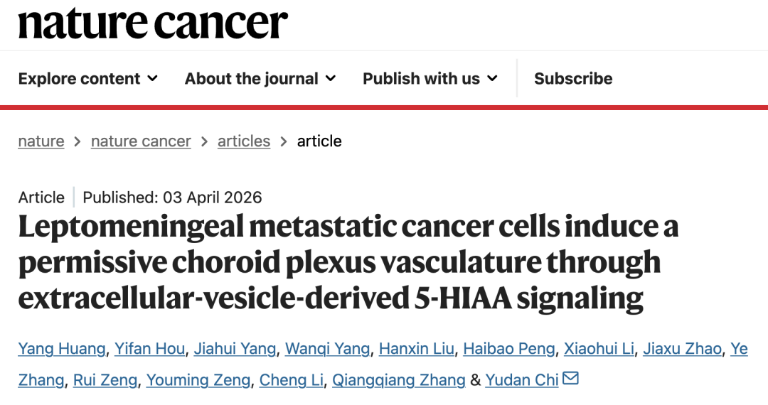 2026 年 4 月 3 日,复旦大学迟喻丹团队在 Nature Cancer 期刊发表了题为:Leptomeningeal metastatic cancer cells induce a permissive choroid plexus vasculature through extracellular-vesicle-derived 5-HIAA signaling 的研究论文。