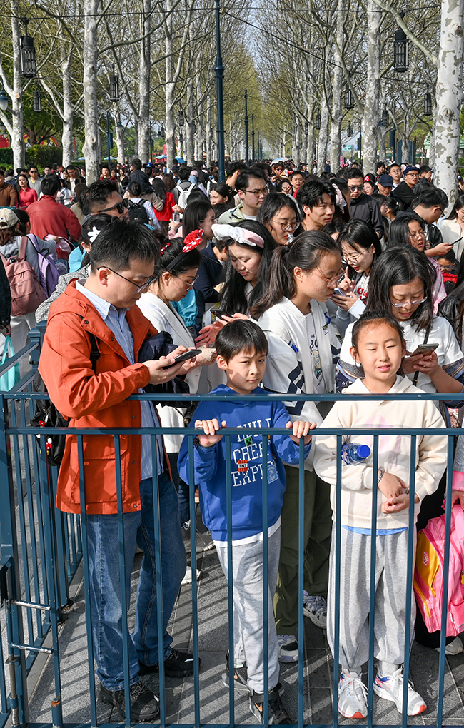 4月5日,上海迪士尼度假区迎来客流高峰,排队等待放行的游客。澎湃新闻记者 朱伟辉 图