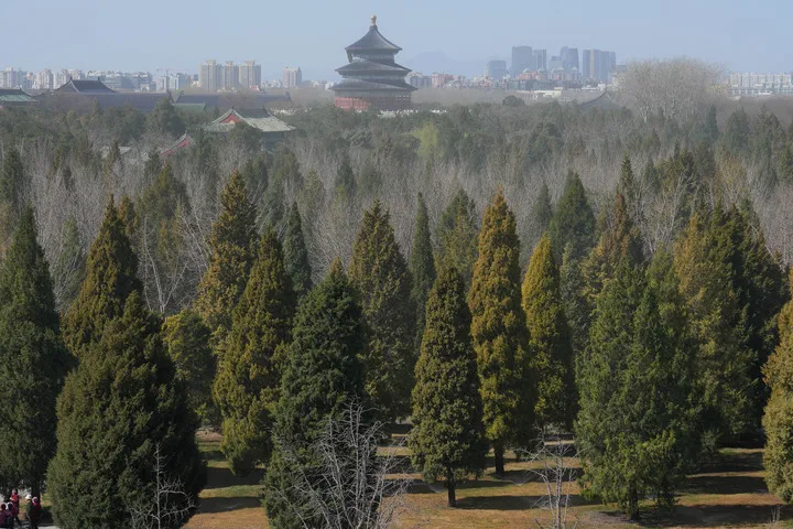 大风吹拂下,北京天坛公园上空弥漫着花粉雾,公园开启草地喷灌设施应对。新华社记者 鞠焕宗 摄