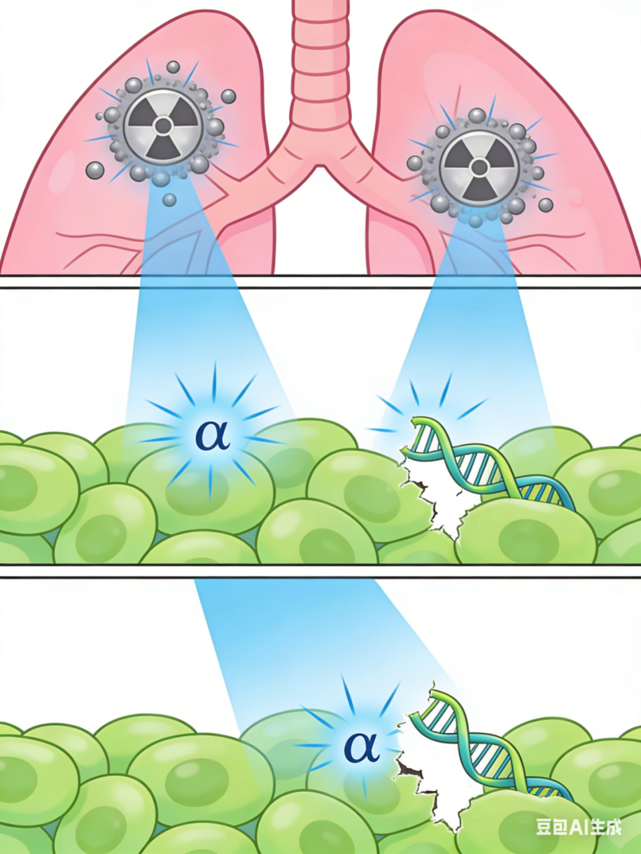 氡气本身衰变周期短,但真正的危险在于其衰变产物——一系列附着在空气中的尘埃颗粒上的放射性金属原子(如钋-218)。当我们呼吸时,这些微粒被吸入人体后,逐渐沉积在肺部气道,持续释放α粒子,如同微小的“子弹”近距离轰击肺细胞,损伤其DNA。