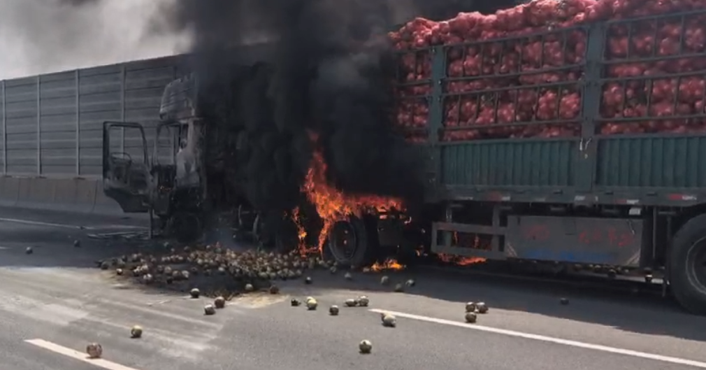 2025年7月,天津市滨海新区一辆拉有30吨洋葱的货车起火,不少洋葱撒落在地。消防员到场后全力将火扑灭,避免了更大的损失。
