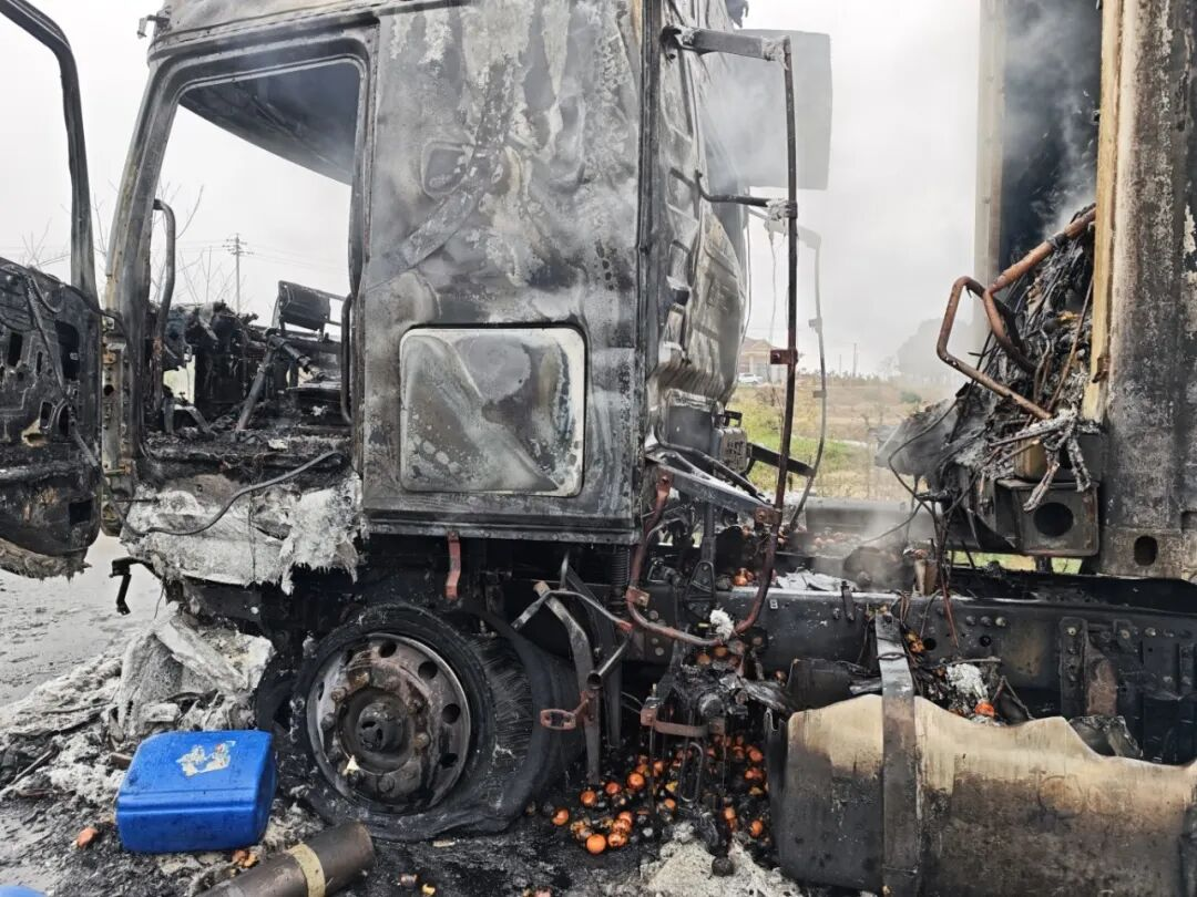 2026年1月,装载28余吨柑橘的一厢式货车在高速路上突然起火,车头几乎完全被火焰“吞噬”。火灾造成货车车头烧毁,货物全部受损。