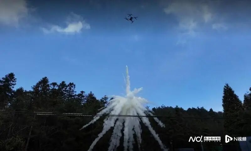 消防无人机实战演练中投递“灭火弹”。
