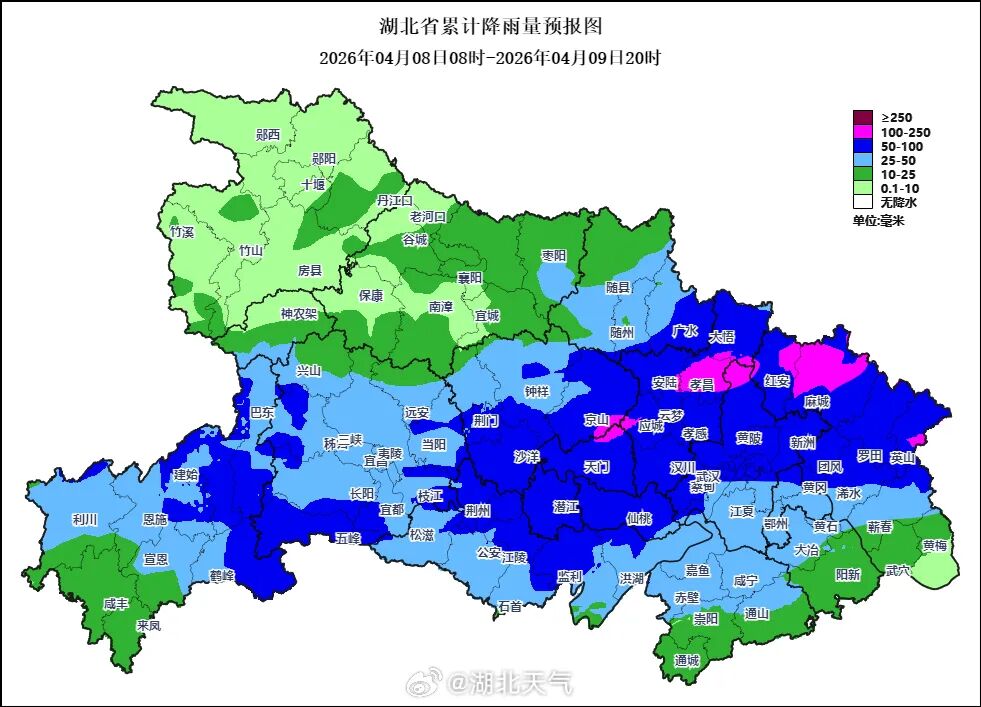 根据气象预报,4月8日至9日白天鄂西南、江汉平原和鄂东北有大雨到暴雨,鄂东北局地大暴雨,鄂东南中雨到大雨、局地暴雨,伴有强对流天气;强对流天气发生时,短时强降水小时雨强20~50毫米,雷暴大风8~11级,局地有冰雹。最强时段为8日傍晚至9日上午。