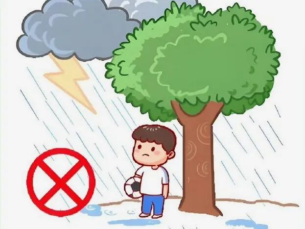 6.雷雨时不要在山顶或者高丘地带停留,不要靠近高压变电室、高压电线和孤立的高楼、烟囱、电杆、大树、旗杆等,不要使用金属工具,不要站在空旷的高地上或大树下躲雨。