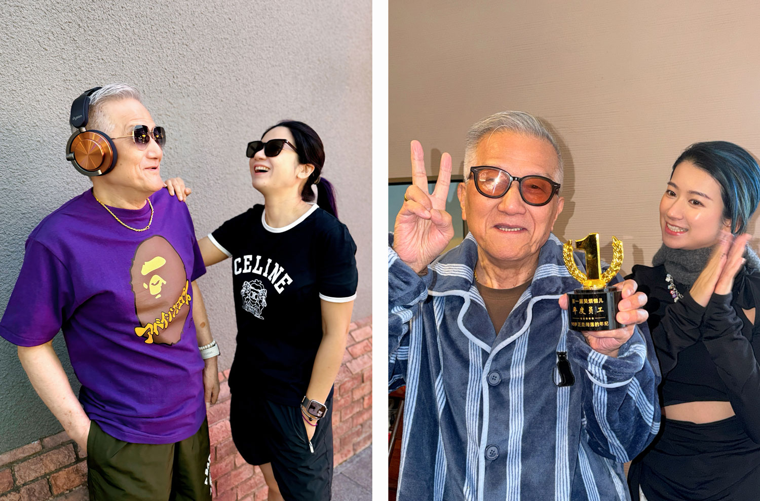 Left: Wu’s grandfather and mother shoot product photos for headphones, June 2025. Right: Wu presents her grandfather with a fake “best employee” award based on followers’ feedback. The cup reads: “90 is basically prime time to go wild,” January 2026. Courtesy of Wu