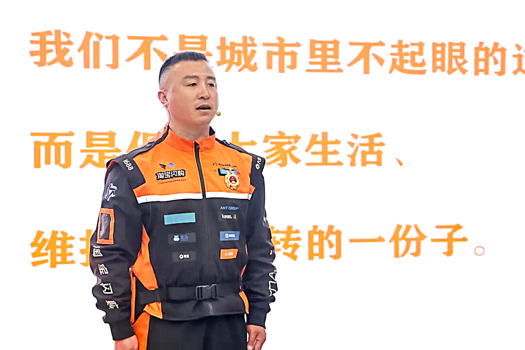 第一位登台的就是张文强。他身着标志性的“骑士橙”工装,以《是骑手,也是城市的微光》为题,讲述自己从脱下军装到穿上“骑士橙”的八年坚守。2016年,张文强从部队退役,脱下穿了12年的“橄榄绿”,从一名军人变成一名网约配送员。刚入行时,上海的宽马路、密小区、高楼群让他晕头转向。但退役军人骨子里有股不服输的劲儿,他天天揣着小本子,每送一单就画张简易地图,标清楚商家出餐快慢、小区门禁位置、电梯等候时间等。三个月下来,笔记记满了,人也晒黑了,他成了站里的“活地图”。