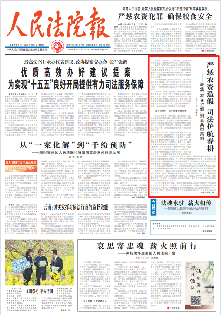 春种一粒粟,秋收万颗子。春耕时节的每一份耕耘,都承载着秋收的希望,而安全、优质的农资,则是耕耘路上的坚实保障。最高法、最高检联合发布的“农资打假”刑事典型案例,既是对农资制假售假犯罪的严厉震慑,也是对农民合法权益的坚定守护。待来日田野间绿意盎然、硕果满枝,既是农家丰收喜悦,也是司法机关以法治之力护航春耕生产、守护国家粮食安全的生动写照。