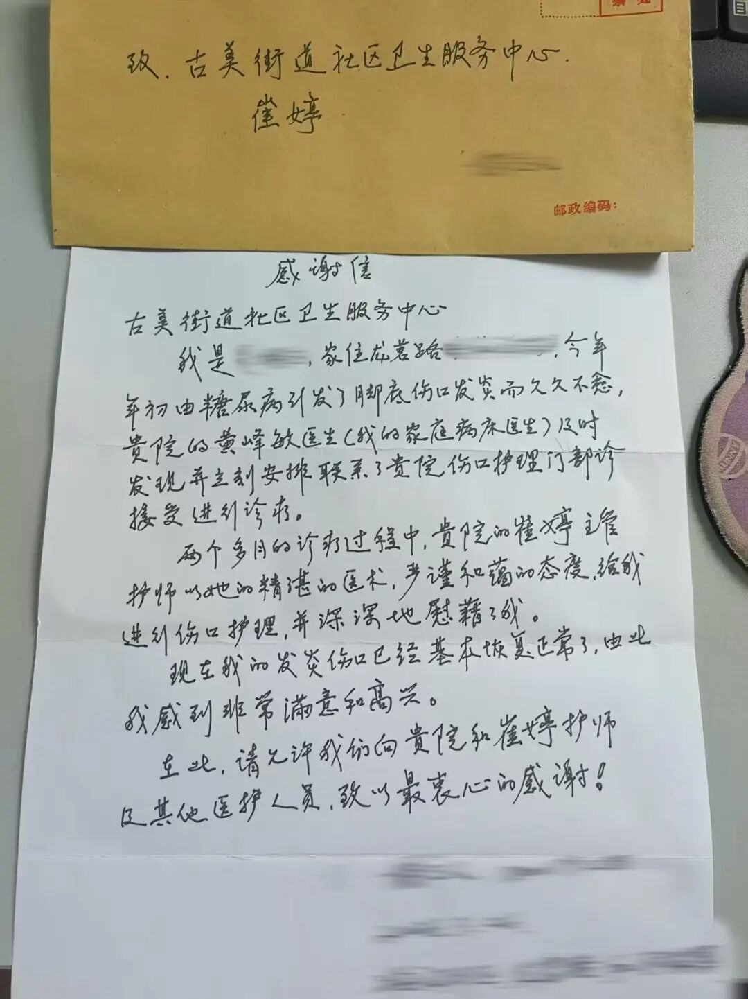 近日,古美社区卫生服务中心收到了一封特别的手写感谢信。没有华丽的辞藻,只有朴实的文字,却藏着最滚烫的心意——居民胡女士写给伤口护理门诊崔婷护士及全体医护人员的 “告白”。