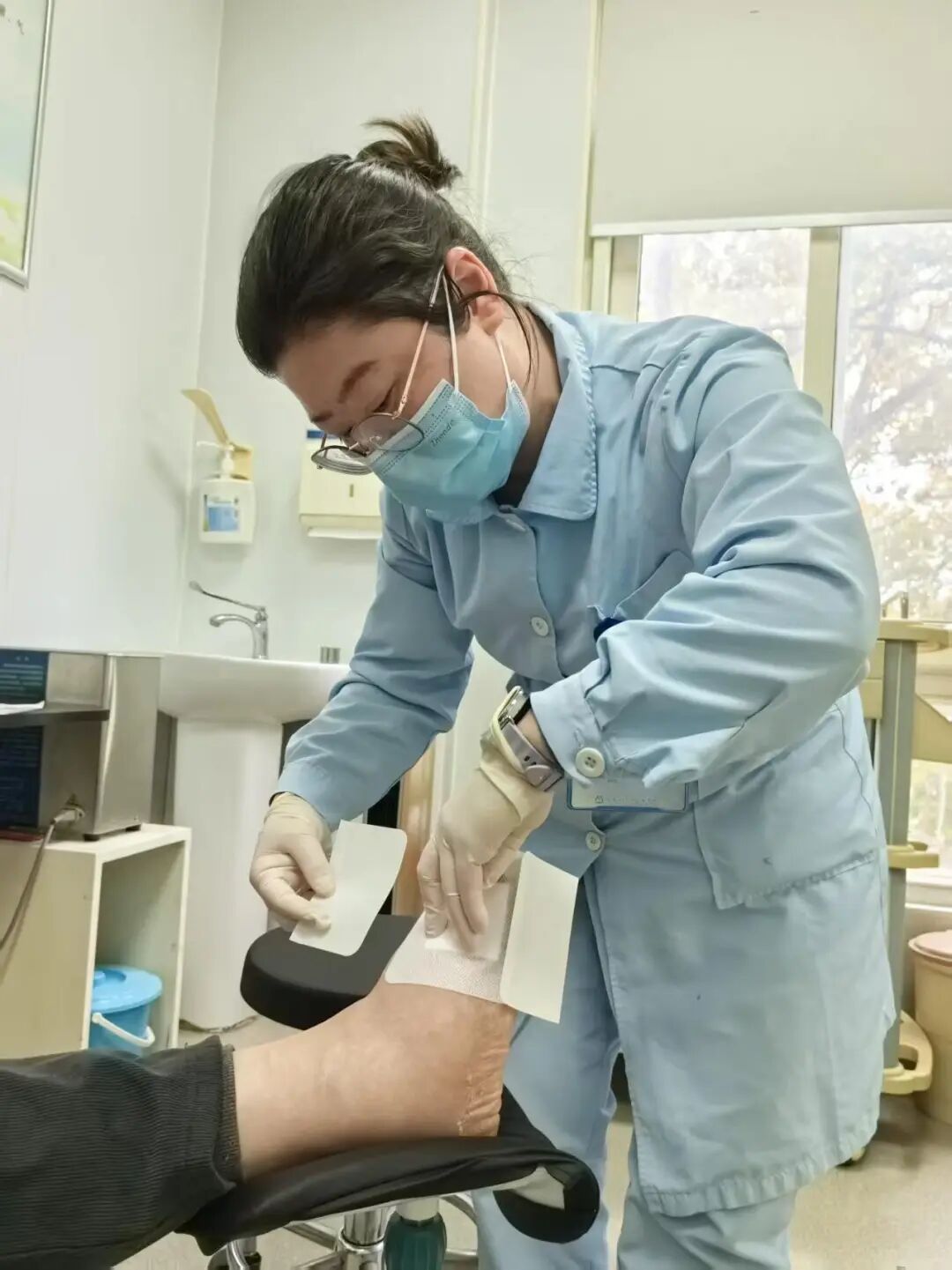 两个月前,专科护士崔婷收到家庭医生黄峰敏发来的一张伤口照片:胡女士足底局部发黑,伴有明显脓性分泌物。经详细问询得知,胡女士因足底皮肤破溃导致感染,加之长期血糖控制不佳,伤口迁延不愈,身心备受煎熬。通过家庭医生与伤口护理门诊的精准对接,胡女士很快接受了专业诊疗。