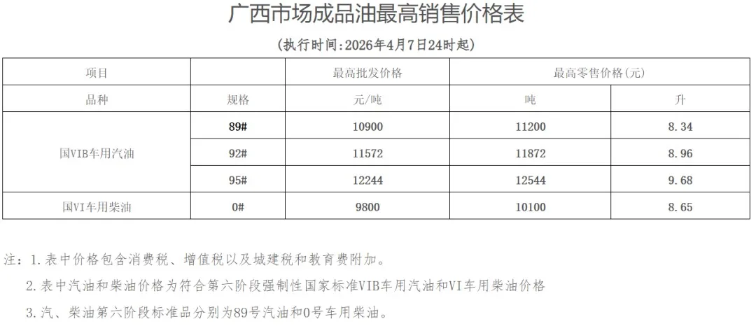 这次成品油价格调整后,广西国VIB标准89号汽油从8.03元/升调整到8.34元/升,每升上调0.31元;92号汽油从8.62元/升调整到8.96元/升,每升上调0.34元;95号汽油从9.31元/升调整到9.68元/升,每升上调0.37元;国VI标准0号车用柴油从8.31元/升调整到8.65元/升,每升上调0.34元。各成品油经营单位要严格执行和广泛宣传国家成品油价格政策,实行明码标价,在明显位置公布成品油价格。各地相关部门要加强对调整后成品油价格的监督检查,切实维护正常市场秩序,消费者可通过12315平台举报价格违法行为。