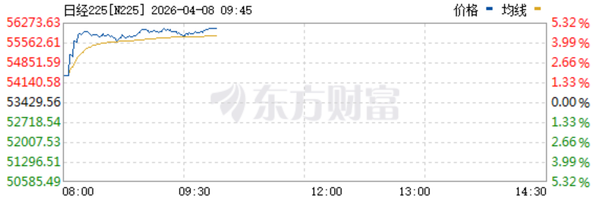 8日早间,日韩股市全线大涨,截至发稿,韩国综合指数上涨5.55%,报5805.86点;日经225指数上涨5.06%,报56131.60点。当日,在KOSPI200期货上涨5%后,韩国交易所启动KOSPI指数熔断机制,程序化交易暂停5分钟。
