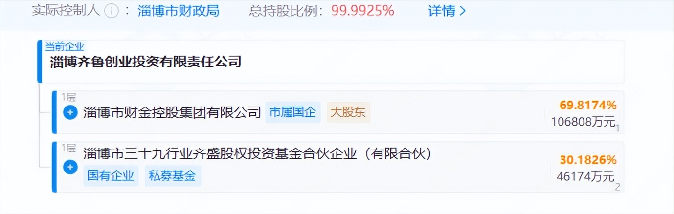 股权穿透显示,淄博市财金控股集团有限公司、淄博市三十九行业齐盛股权投资基金合伙企业(有限合伙)分别对其持股69.82%、30.18%,公司实际控制人是淄博市财政局。