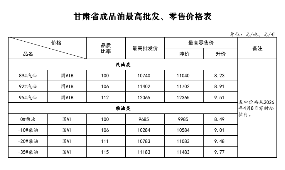 根据国家统一安排部署,自2026年4月8日零时起,我省汽、柴油标准品价格分别上调420元、400元。调整后的各牌号汽、柴油最高批发、零售价格见附表。