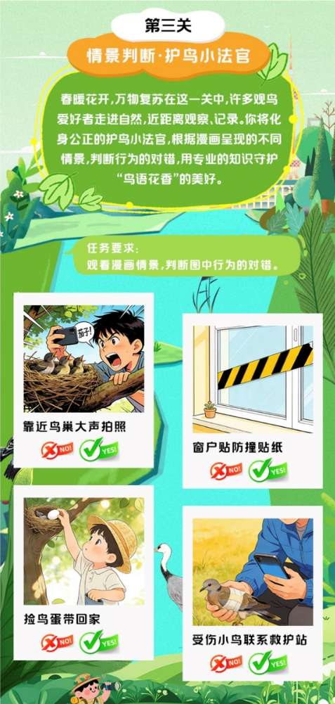 春暖花开,万物复苏。在这一关中,许多观鸟爱好者走进自然,近距离观察、记录。你将化身公正的护鸟小法官,根据漫画呈现的不同情景,判断行为的对错,用专业的知识守护“鸟语花香”的美好。