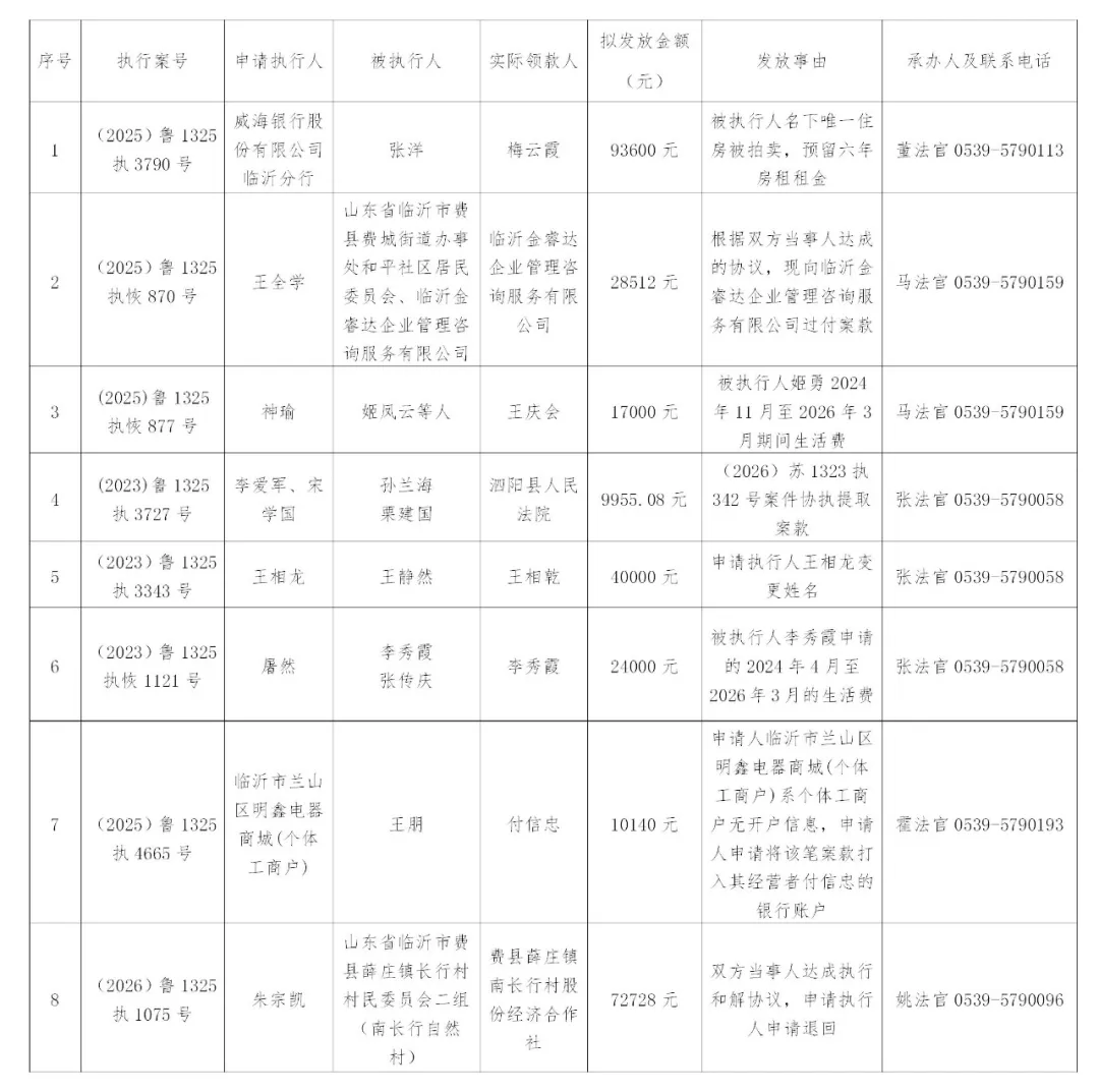 费县人民法院关于向案外人发放执行案款信息的公示(2026年第12期)