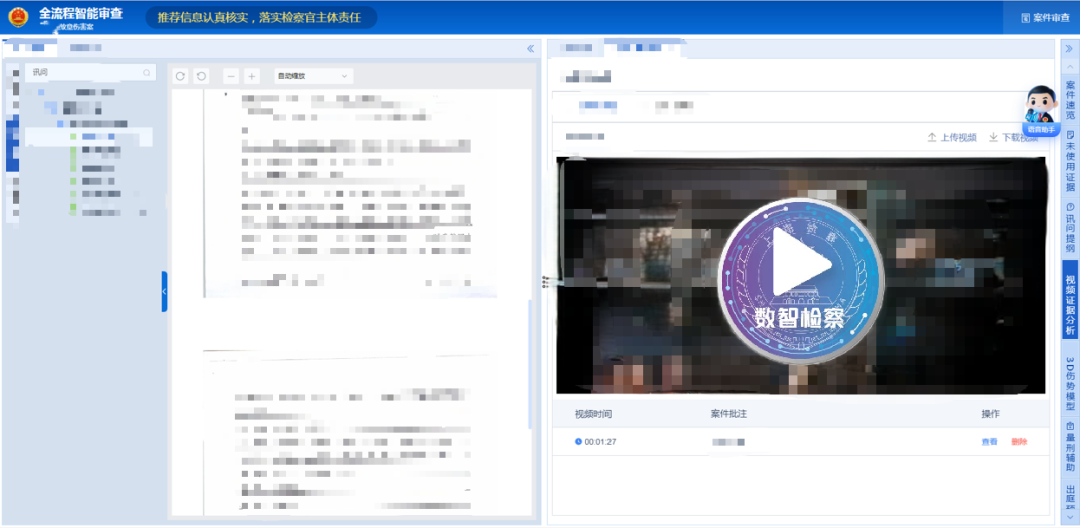 基于上海数字政法建设成果,检察官在案件智能辅助界面即可打开并阅览本案视频,依托行业领先的多模态大模型,智能提取视频关键要素,总结摘要信息,供检察官快速定位,并对视频证据进行分析,形成更牢固的证据链。