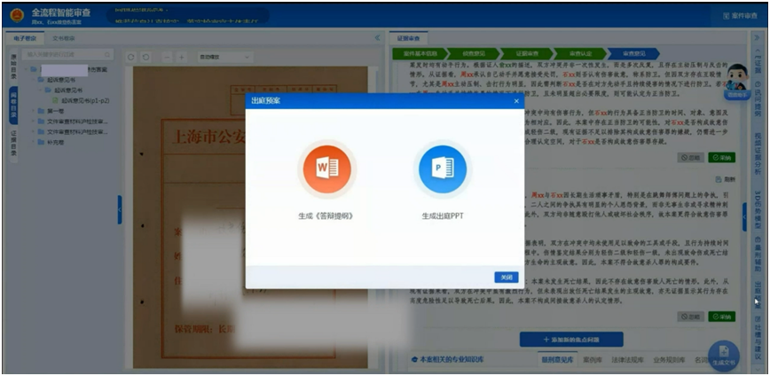 持续拓展智能化应用广度,将智慧赋能延伸到案件办理上下游,智能生成多媒体示证演示文稿,囊括重要示证内容和重点关注问题,帮助检察官在庭审调查和辩论环节提高效率。