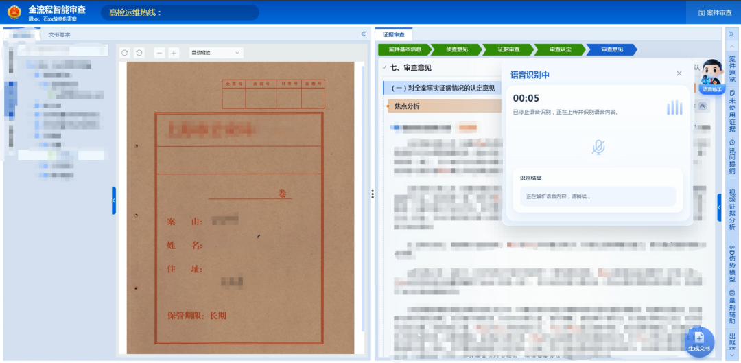 不断挖掘智能化应用深度,除视频类多模态信息外,增强人机智能交互能力,依托专用语音模型,支持检察官通过语音控制功能导航、卷宗查找、焦点分析等,极大节省检察官线上办案精力。