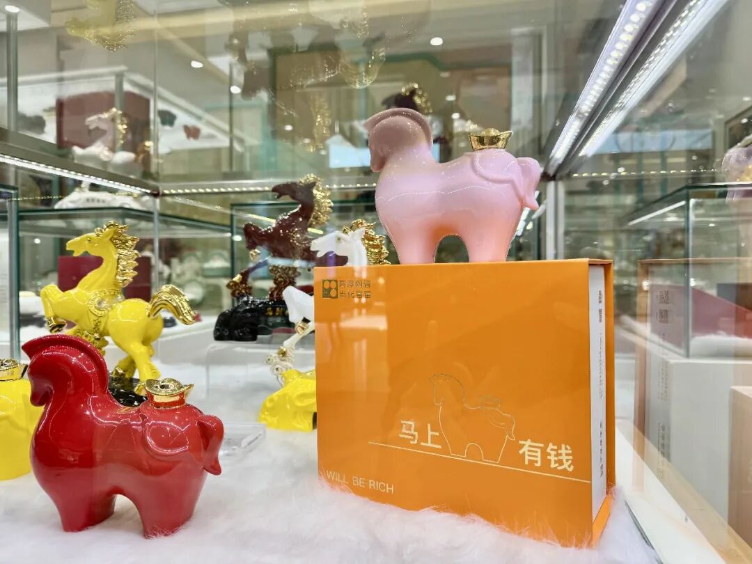 今年C位当属高淳陶瓷爆款马年文创——“马上有钱”陶瓷小马,憨态可掬,寓意讨喜,一上线订单破千万。还有奔马挂盘、祥云纪念盘、创意茶杯……传统釉色与马年元素巧妙融合,让千年陶瓷彻底“潮了起来”。