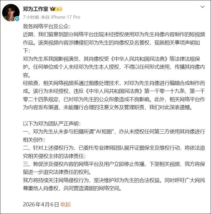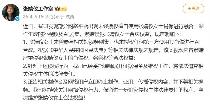 4月6日,演员张婧仪、龚俊、邓为接连发布抵制AI短剧侵权声明。张婧仪工作室称,网络平台出现未经授权擅自使用其肖像进行融合、制作生成的短视频及AI剧集,已委托律师开展证据保全及维权工作;龚俊工作室强调采用AI合成等技术使用其肖像制作剧集的行为构成侵权,正告相关主体立即停止传播、下架相关视频;邓为工作室则表示针对侵权行为将依法追究法律责任。据不完全统计,从4月5日至4月8日,包括易烊千玺、邓为、龚俊、李沁、张婧仪、檀健次等在内的十余位艺人陆续通过工作室发布声明,要求下架侵权短剧。