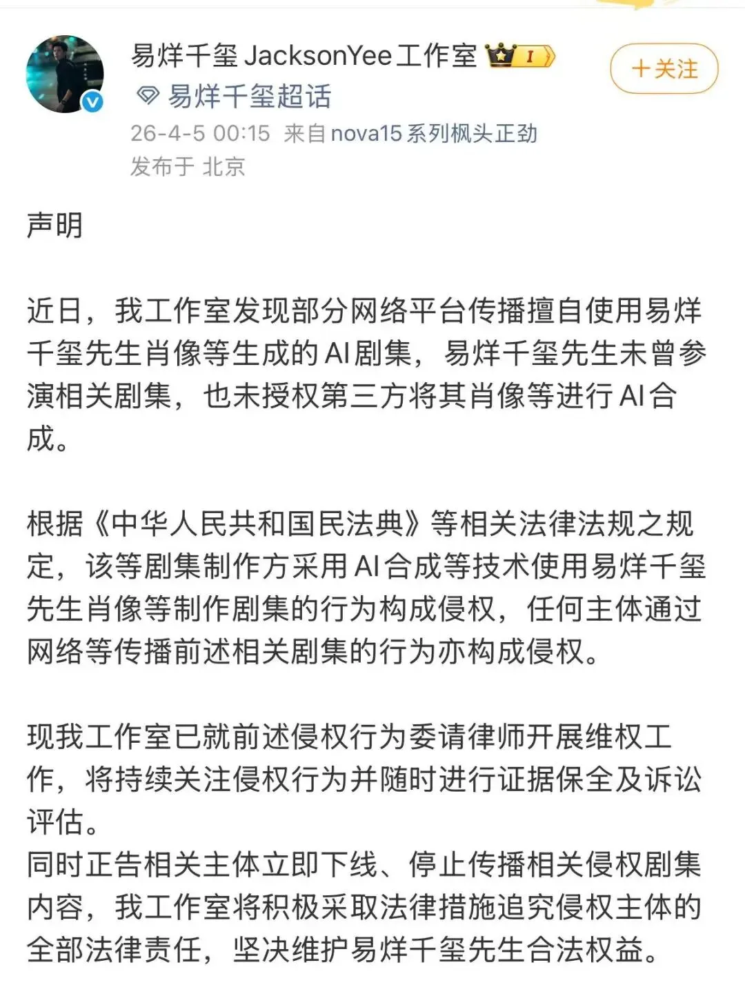 明星成AI“盗脸”重灾区,维权声明密集发布。2026年4月5日凌晨,演员易烊千玺工作室发布严正声明,称发现部分网络平台传播擅自使用其肖像等生成的AI剧集,易烊千玺未曾参演相关剧集,也未授权第三方将其肖像等进行AI合成,工作室已就侵权行为委请律师开展维权工作。消息一出,舆论哗然。据网友反映,《午夜公车:她捉诡超凶!》《骗我投个好胎?行,你们别后悔》等多部AI短剧主角不仅高度“撞脸”易烊千玺,就连声音也高度相似,其中一部短剧在该平台的热度值接近7500万。