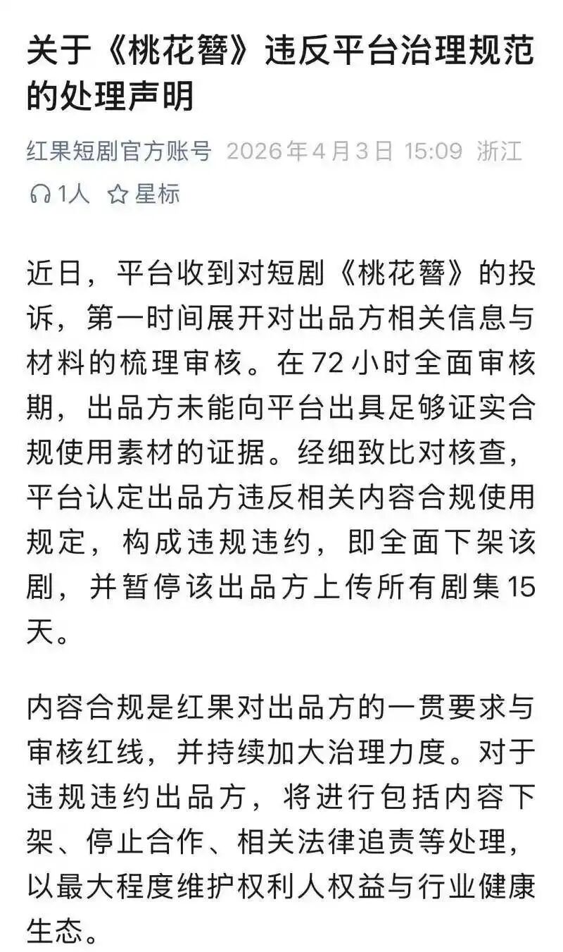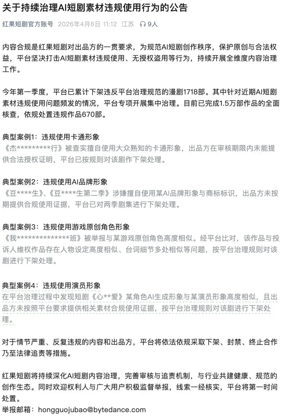 4月6日,红果短剧发布《关于持续治理AI短剧素材违规使用行为的公告》,明确坚决打击AI短剧素材违规使用、无授权盗用等行为。数据显示,今年第一季度,该平台已累计下架违反平台治理规范的漫剧1718部,针对近期AI短剧素材违规使用问题频发的情况,已完成1.5万部作品的全面核查,依规处置违规作品670部。平台表示,对于情节严重、反复违规的内容和出品方,将依法依规采取下架、封禁、终止合作乃至法律追责等措施,坚决维护权利人合法权益。