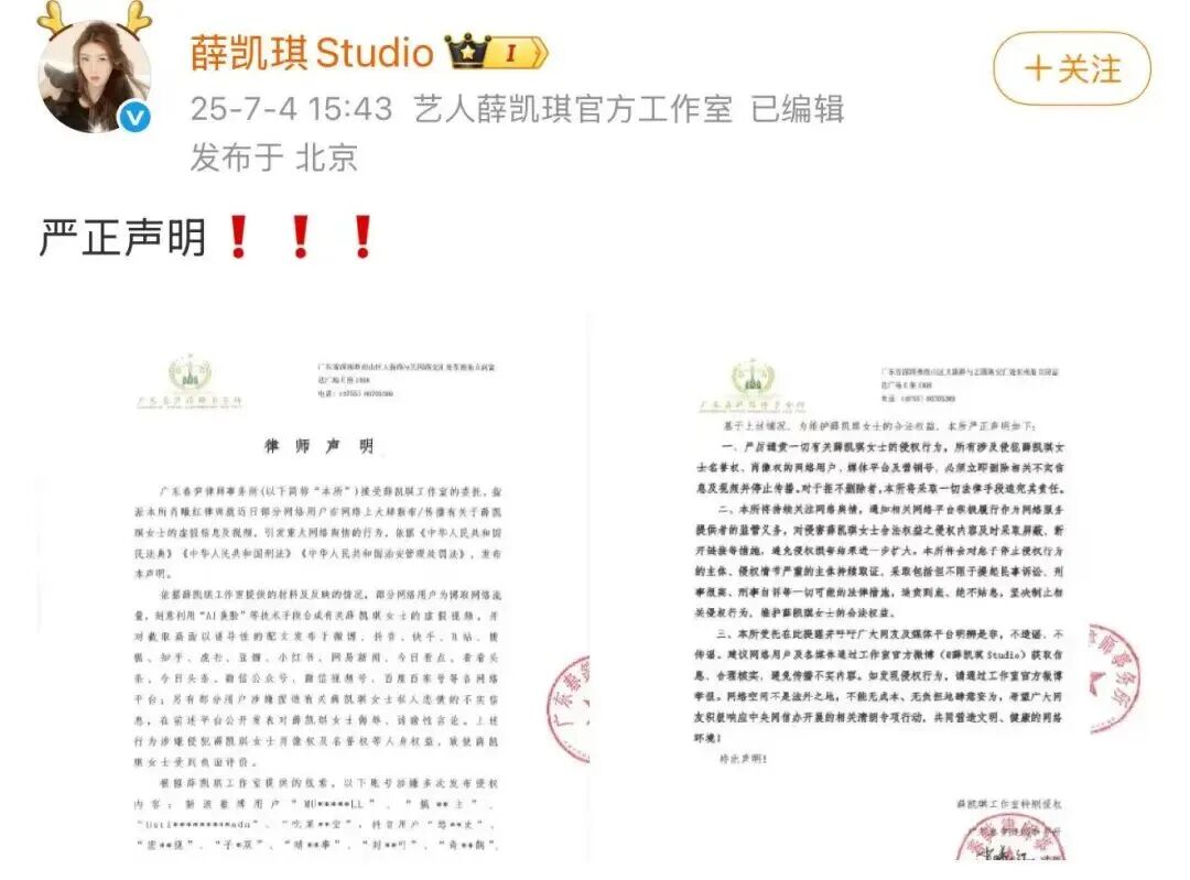 杨紫工作室发文:针对某作品未经授权,利用AI换脸、深度合成等技术,擅自使用杨紫女士的肖像制作并传播视频内容的行为,严重侵犯杨紫女士合法权益。工作室已委托律师对侵权内容进行取证,并将通过法律途径追究到底!