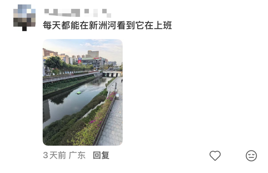 不少网友也偶遇过它:“我也拍过”、“每天在新洲河看到它在上班”,还有网友拍到它下班的样子。