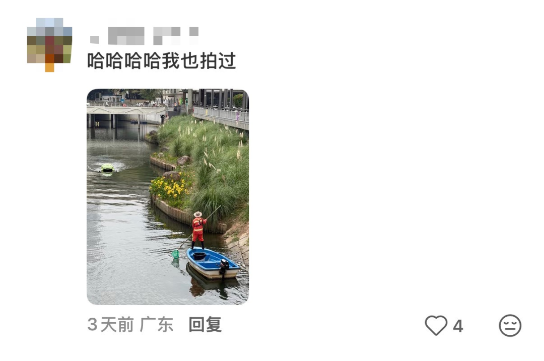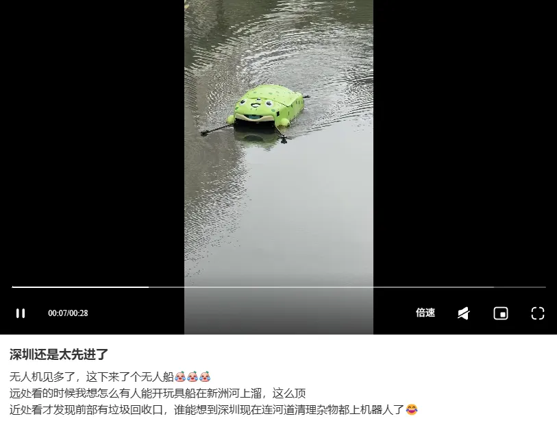 网友表示:“远处看还在想,怎么有人能开玩具船在新洲河上溜。近处看才发现,前部有垃圾回收口,谁能想到深圳现在连河道清理都有机器人了。”