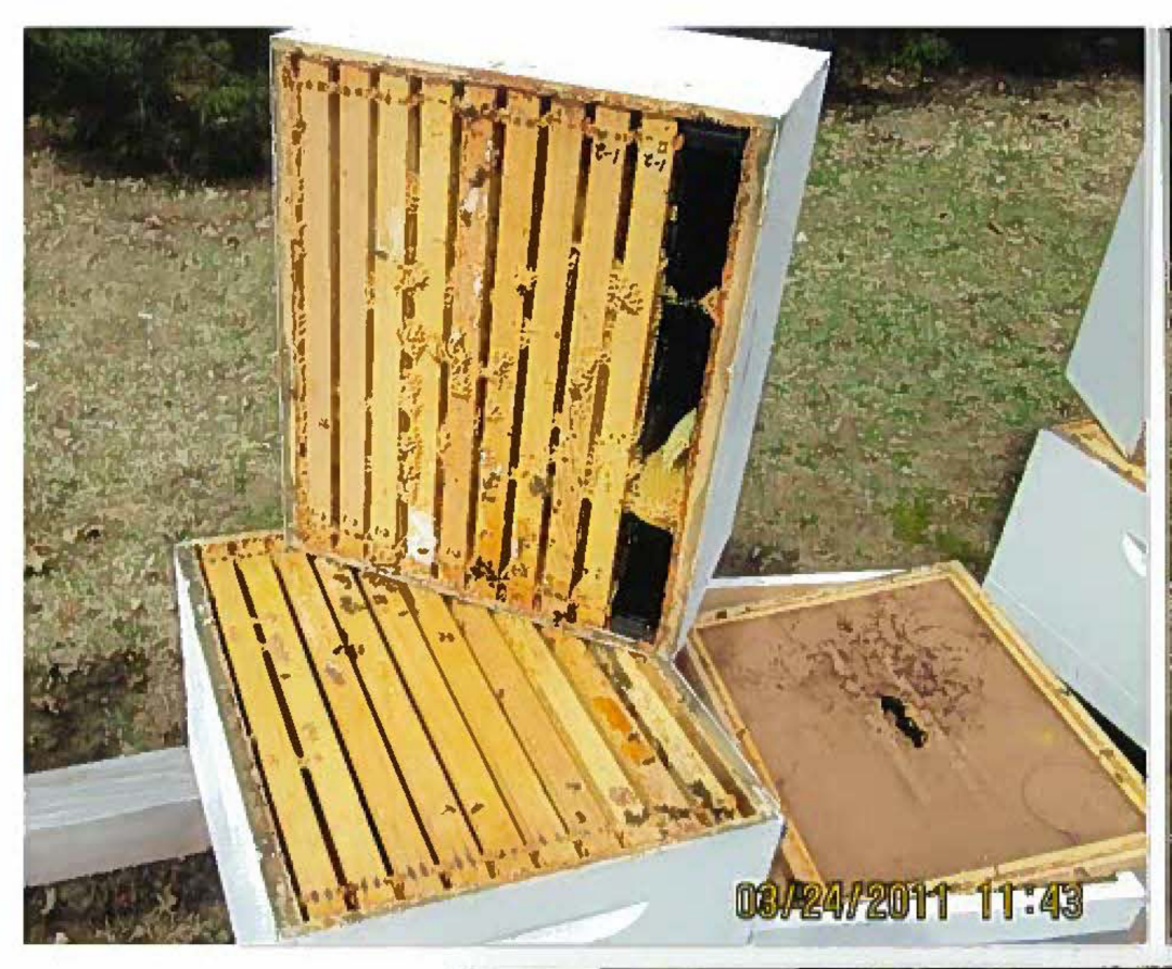 整个现场实验在2011年3月底正式结束,因为实验组只剩下一个蜂巢,根据瓦尔霍尔先生的判断,这个存活下来的实验组蜂巢里的蜂后的健康状态也不是很好,所以我们决定清点所有的实验蜂巢。实验的结果是16个实验组的蜂巢有15个发生了CCD现象,而4个对照组的蜂巢有3个安全过冬存活了下来,死亡的对照组蜂巢是因为疾病而死亡,并没有发生CCD现象。