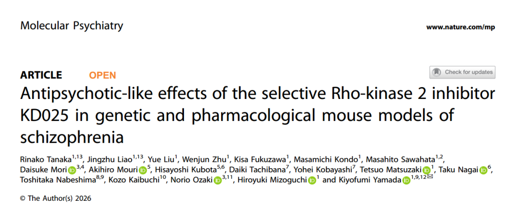 这项研究标题为《Antipsychotic-like effects of the selective Rho-kinase 2 inhibitor KD025 in genetic and pharmacological mouse models of schizophrenia》,相关成果发表在《Molecular Psychiatry》期刊上。