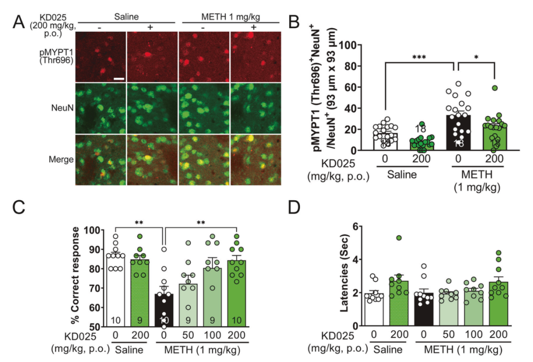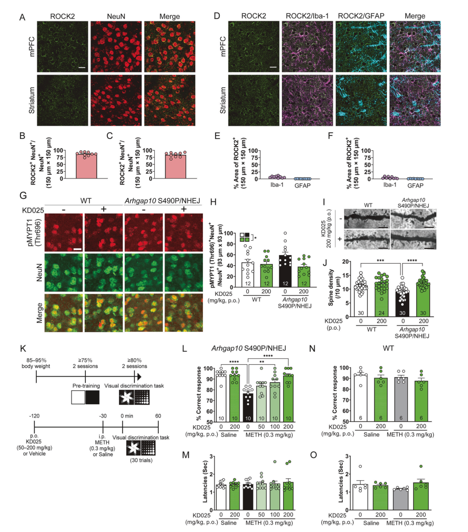在基因缺陷小鼠模型(ARHGAP10突变)上,低剂量甲基苯丙胺会诱发小鼠认知受损,KD025治疗后,视觉辨别任务正确率显著提升;甲基苯丙胺诱导的认知障碍模型上,KD025同样改善了认知,但对药物引起的多动效果较弱;MK-801诱导的精神分裂症模型上,KD025不仅改善了视觉辨别和新物体识别记忆,还显著抑制了多动行为。