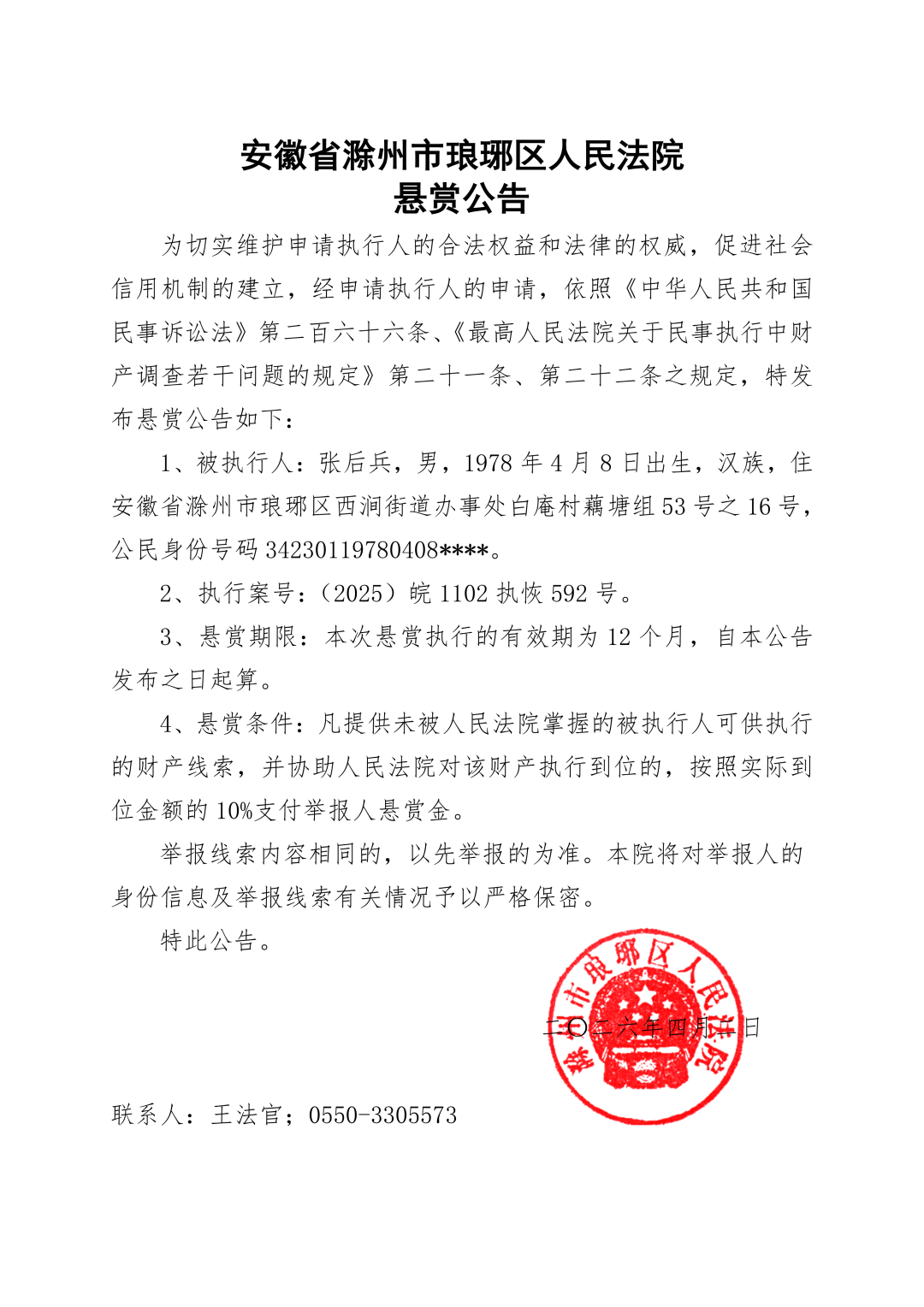 原标题:《安徽省滁州市琅琊区人民法院悬赏公告》