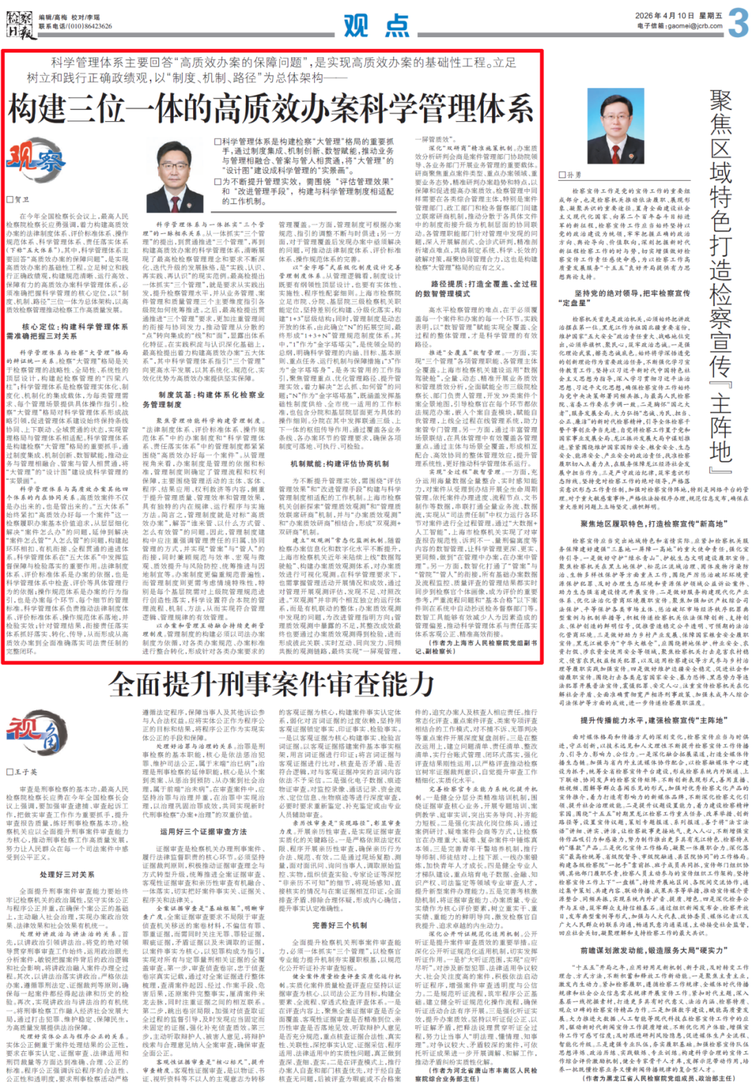 《检察日报》刊发署名文章:构建三位一体的高质效办案科学管理体系