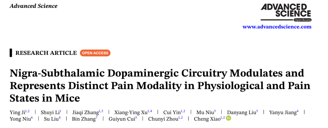 2026年4月7日,徐州医科大学肖诚、周春艺和徐州医科大学附属医院崔桂云团队在《Advanced Science》上发表的研究《Nigra-Subthalamic Dopaminergic Circuitry Modulates and Represents Distinct Pain Modality in Physiological and Pain States in Mice》,第一次发现了一条全新的痛觉环路。
