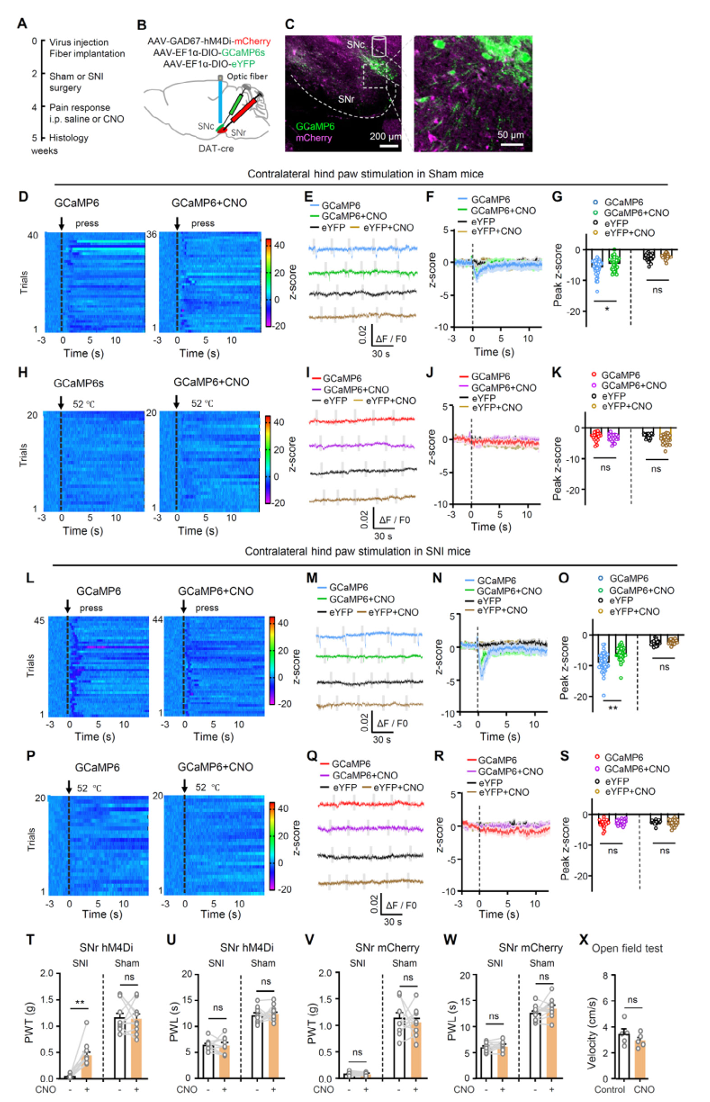 SNr的GABA能神经元直接抑制投向STN的SNc多巴胺神经元。机械刺激和热刺激都会激活SNr GABA能神经元,进而抑制下游多巴胺通路。用化学遗传学抑制SNr GABA能神经元,能减弱机械刺激带来的多巴胺神经元抑制,并提升神经病理痛小鼠的机械痛阈值。