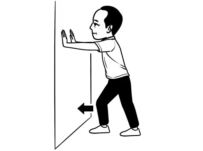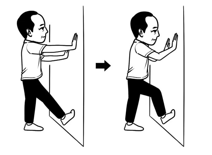 2.用手掌压着墙,弯曲一侧膝盖,保持另一侧膝盖伸直;弯曲的膝盖慢慢向前靠,尝试保持另一条腿的足跟平贴在地面上,感觉跟腱和足弓被拉伸时保持10秒,然后放松。