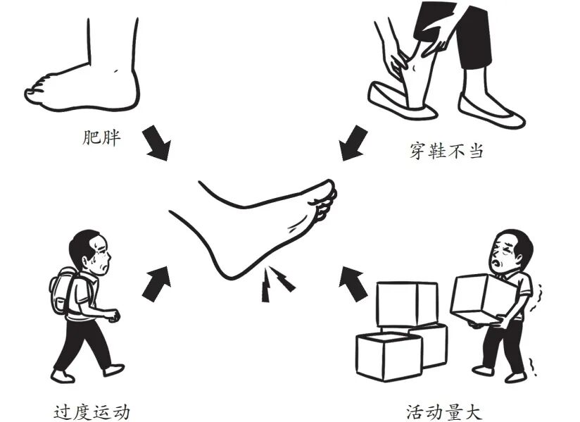 足底筋膜炎是一种常见的足踝部软组织炎症。肥胖、穿鞋不当、过度运动、活动量大是引发足底筋膜炎的主要原因。