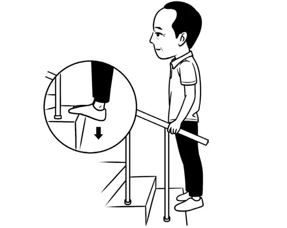 4.在楼梯的最底阶用前脚掌保持平衡站立,慢慢降低足跟,直到感觉小腿肌肉拉伸,保持10秒,然后站起来,重复上述动作。